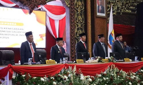 Pemayung.id – Ketua DPRD Provinsi Jambi, Edi Purwanto didamping Wakil Ketua DPRD Provinsi Jambi, Pinto Jayanegara, dan Burhanudin Mahir memimpin rapat paripurna dalam rangka mendengarkan Pidato Kenegaraan Presiden RI Dalam Rangka Peringatan HUT ke-79 Kemerdekaan Republik Indonesia Tahun 2024, di Ruang Rapat Paripurna DPRD Provinsi Jambi, Jumat pagi (16/08/2024).