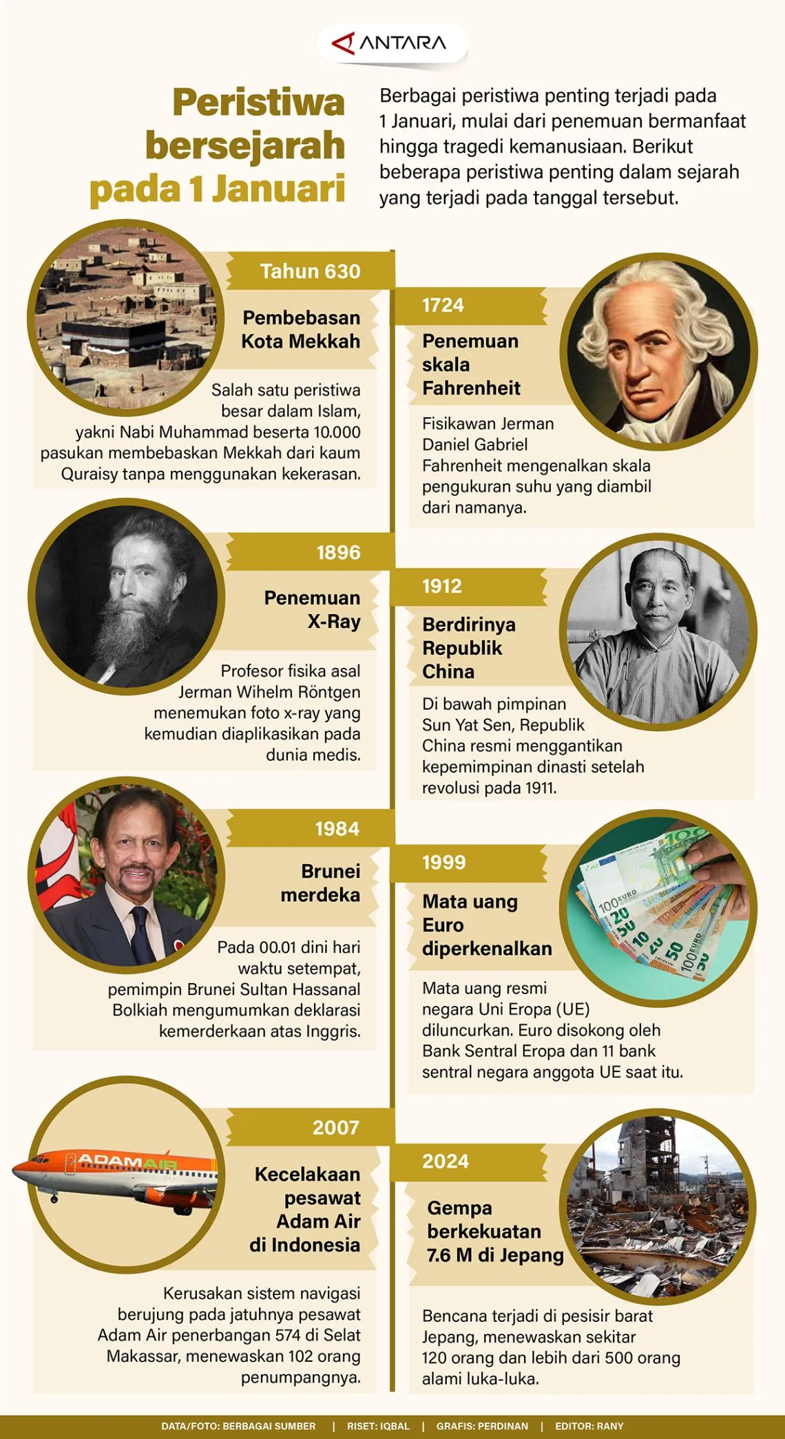 Pemayung.id – Berbagai peristiwa penting terjadi pada 1 Januari, mulai dari penemuan bermanfaat hingga tragedi kemanusiaan. Berikut beberapa peristiwa penting dalam sejarah yang terjadi pada tanggal tersebut. (Ant)