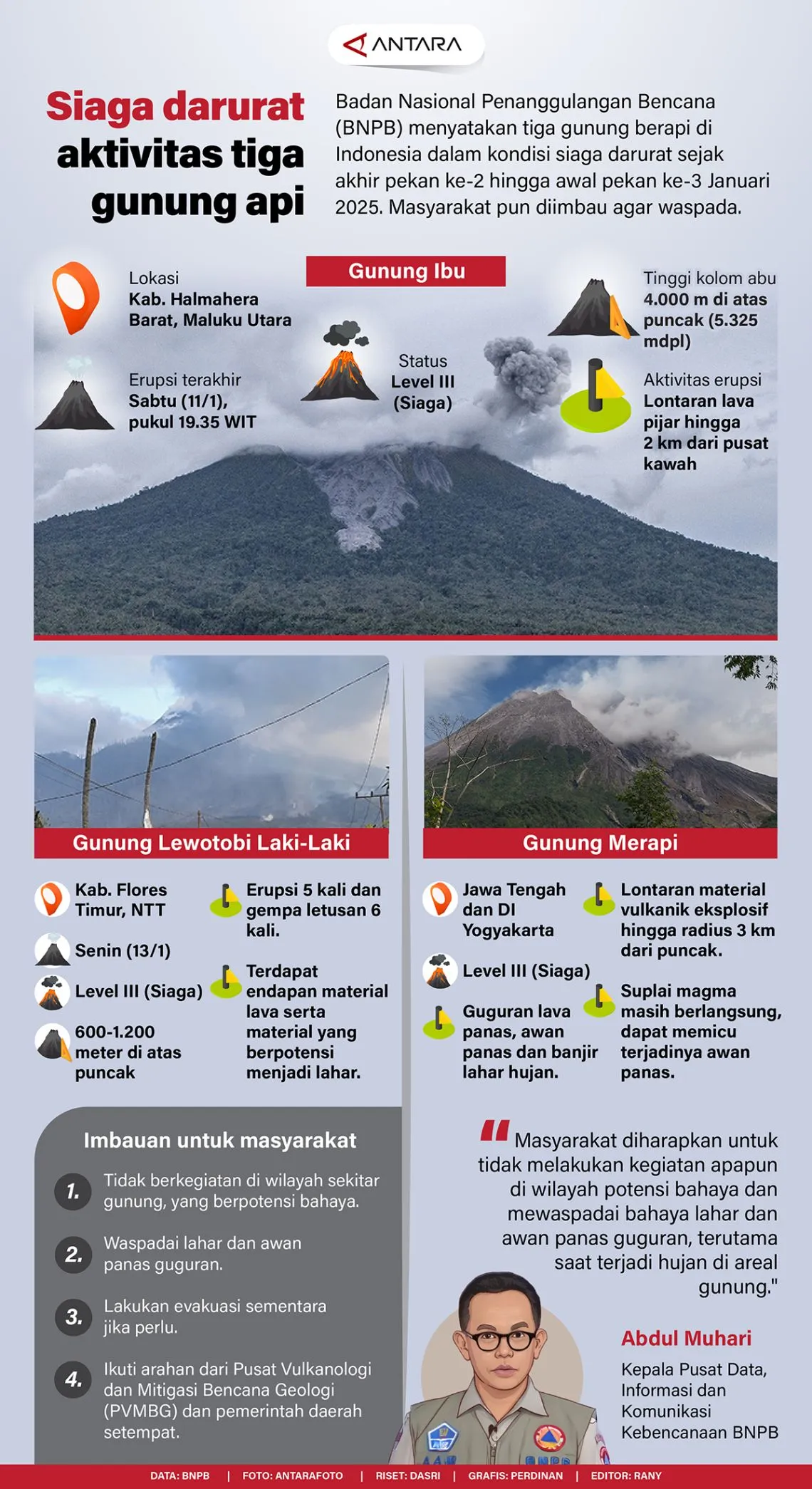 Pemayung.id – Badan Nasional Penanggulangan Bencana (BNPB) menyatakan tiga gunung berapi di Indonesia dalam kondisi siaga darurat sejak akhir pekan ke-2 hingga awal pekan ke-3 Januari 2025. Masyarakat pun diimbau agar waspada. (Ant)