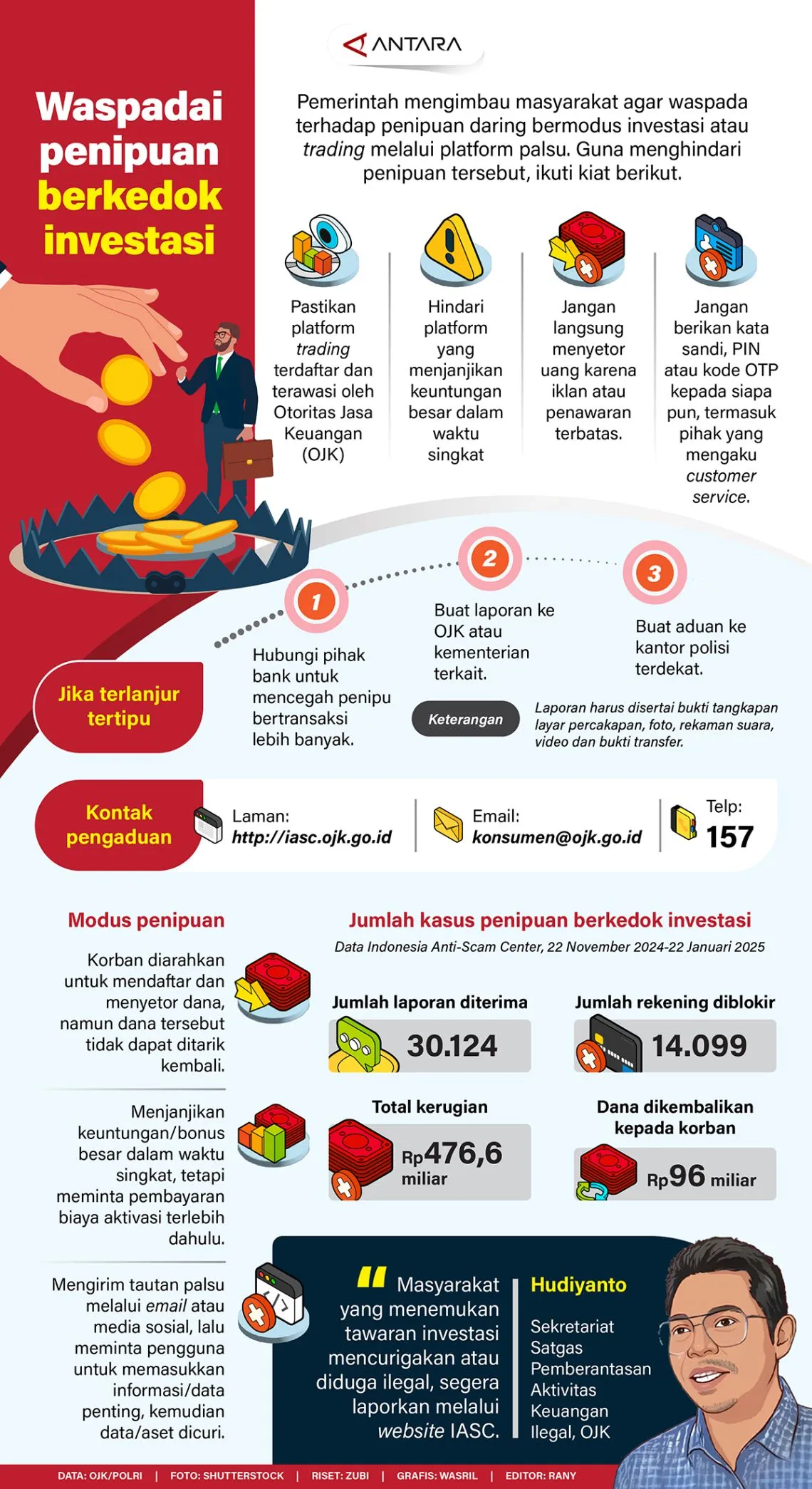 Pemayung.id – Pemerintah mengimbau masyarakat agar waspada terhadap penipuan daring bermodus investasi atau trading melalui platform palsu. Guna menghindari penipuan tersebut, ikuti kiat berikut. (Ant)